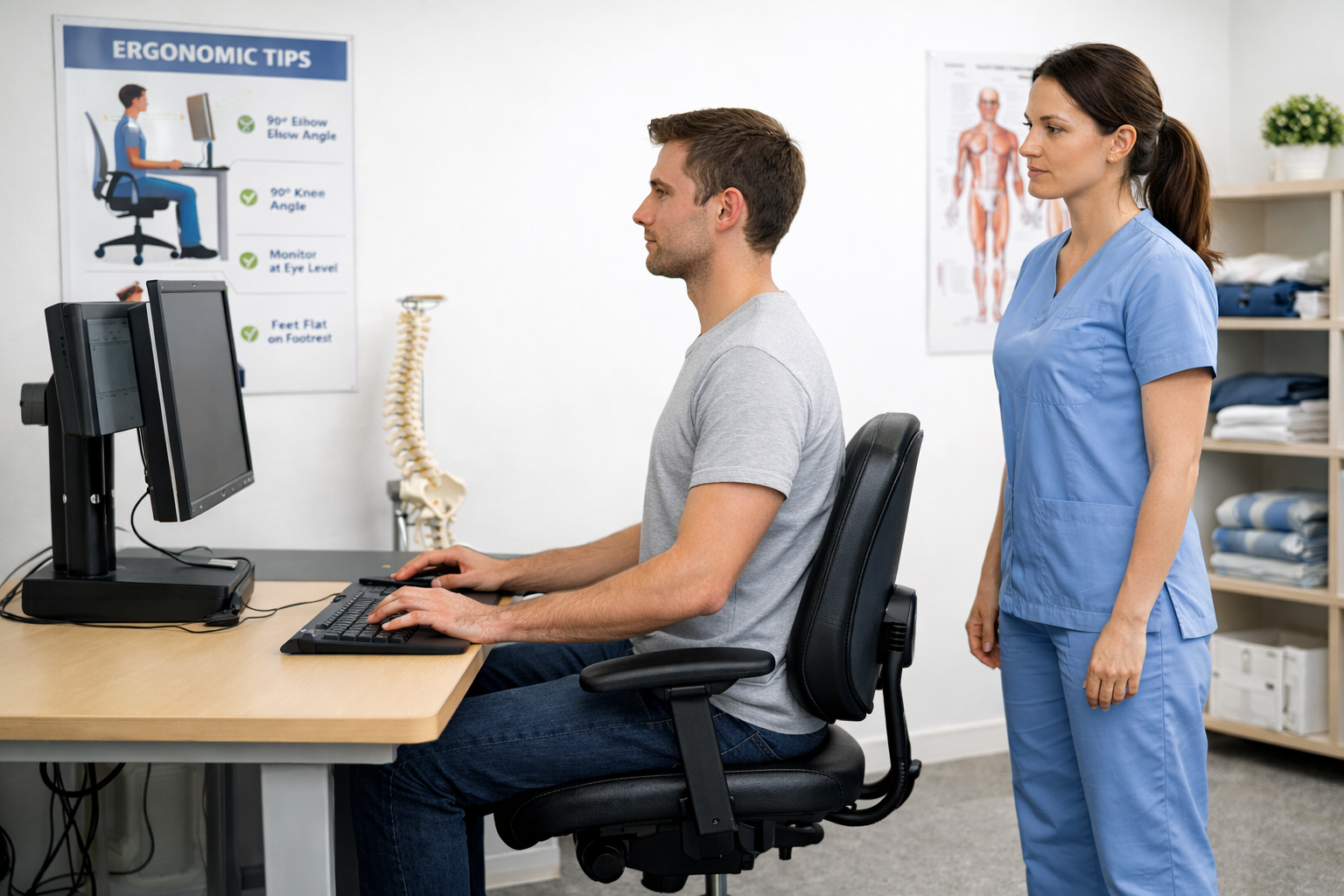 Background Suggestion: Clean image of a professional at a well-set-up desk (remote worker, diverse ethnicity), or split image showing poor vs. optimal posture.